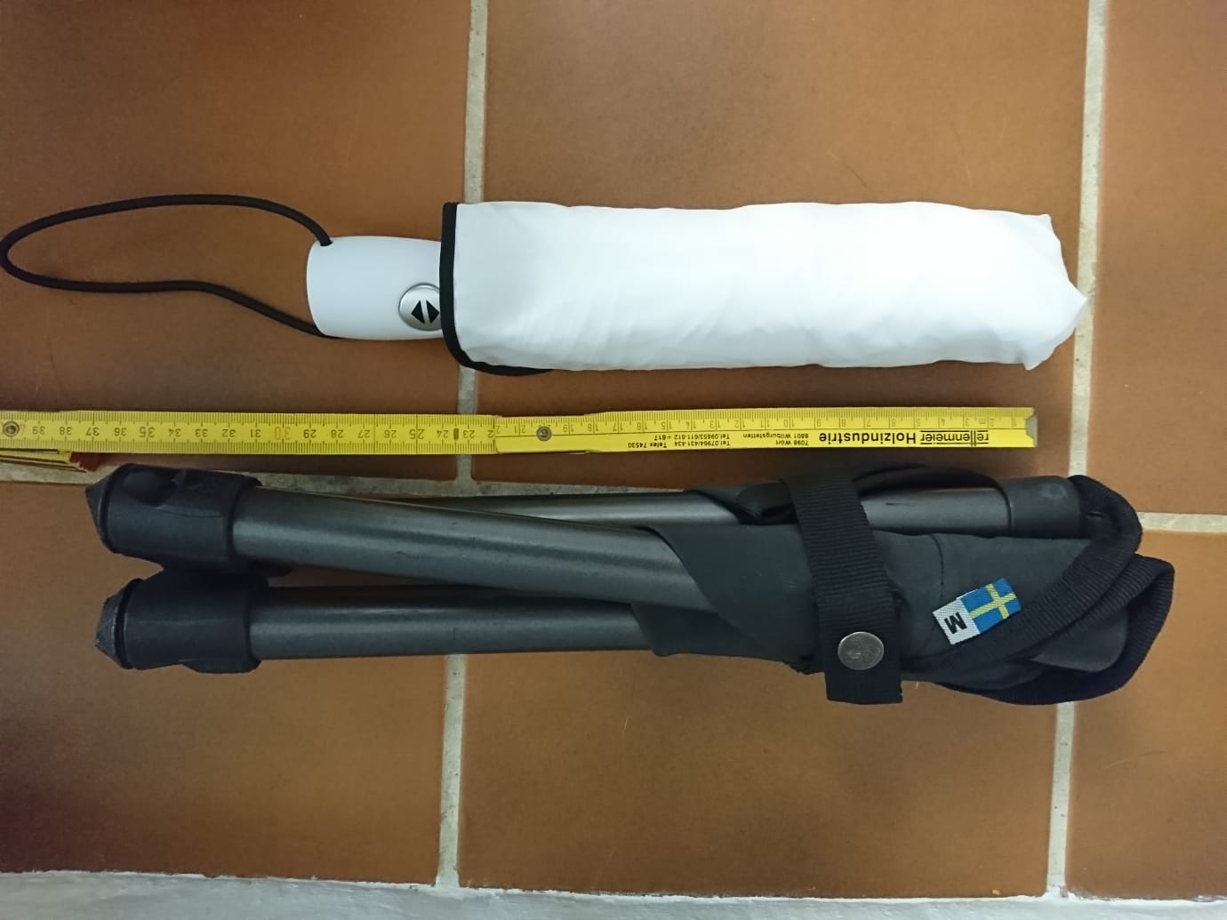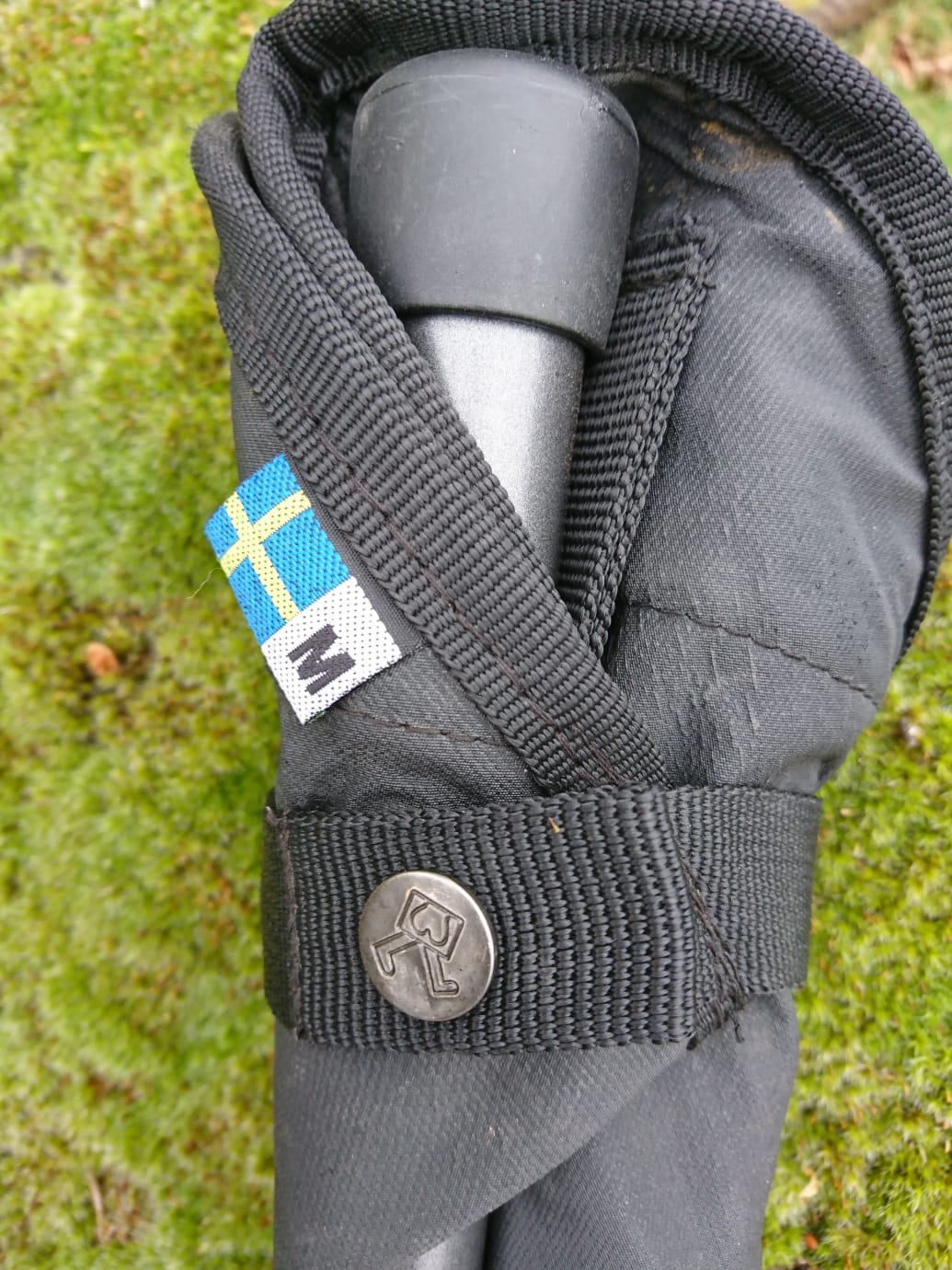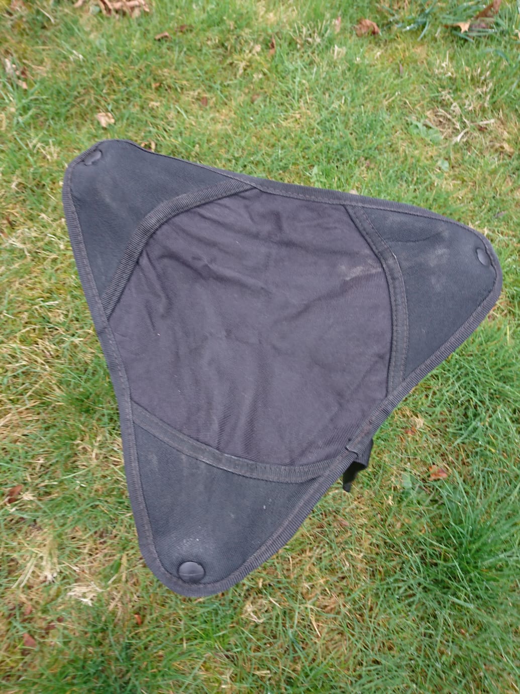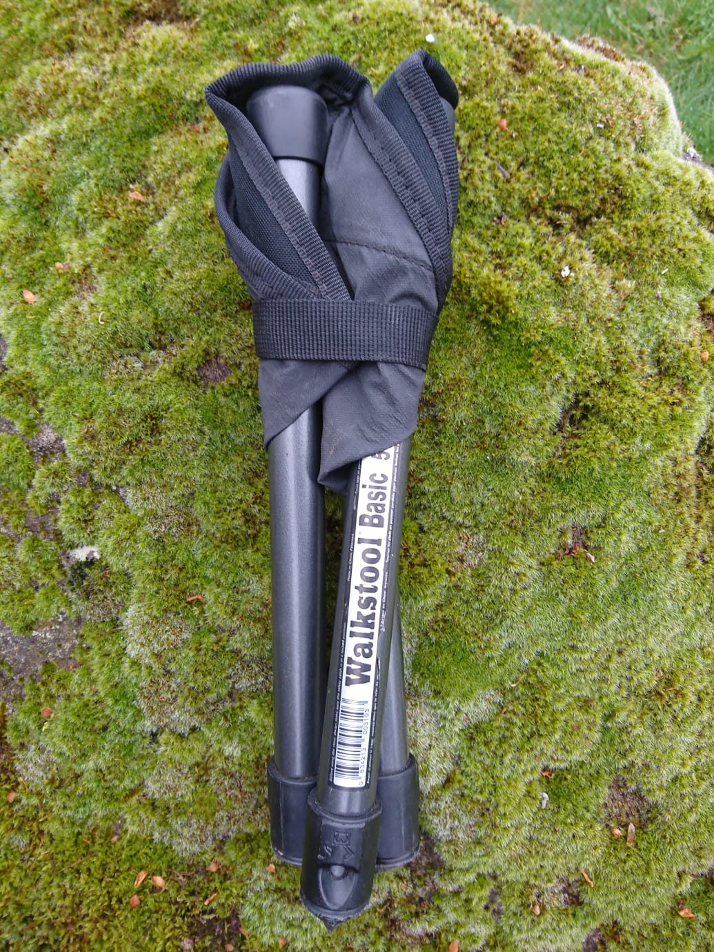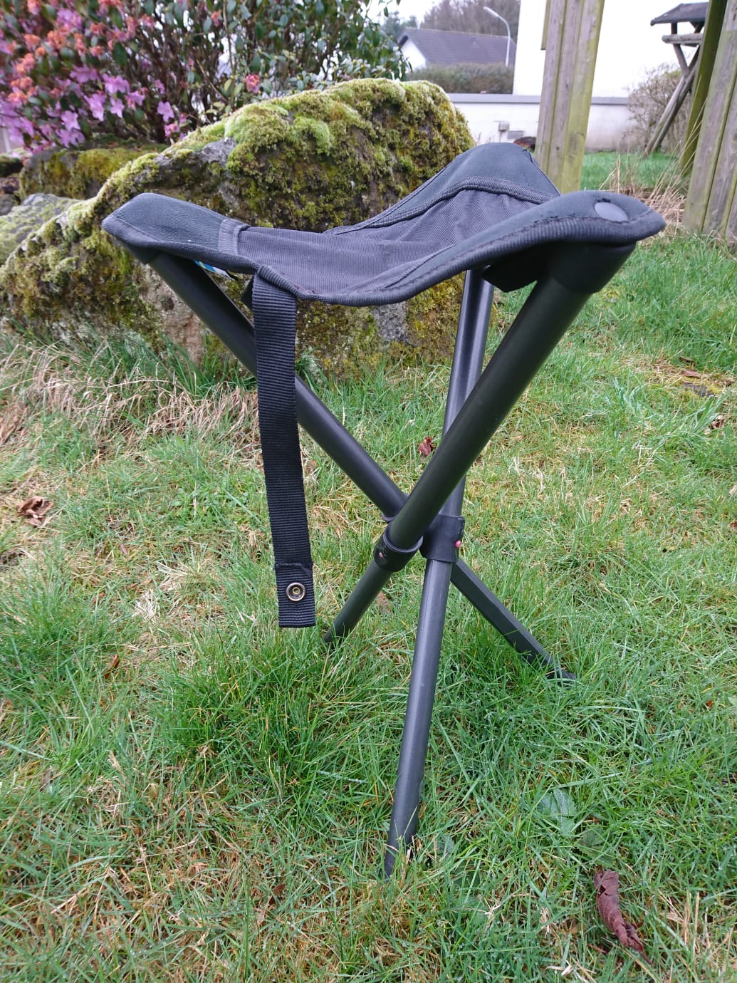 Zum Zusammenlegen wird der Sitzstoff einfach in die Mitte gedrückt, das Halteband einmal rumgeschlungen und mit einem metallenen Druckknopf geschlossen. Der Dreibeinhocker ist dann nur noch etwas grösser als ein zusammengefalteter Taschenschirm, ca. 37cm hoch und 8cm im Durchmesser. Laut des schwedischen Herstellers ist der Hocker bis zu 150Kg belastbar. Die maximale Seitenlänge der Sitzfläche beträgt 38cm, zum sitzen bleiben dann ca. 28cm übrig.