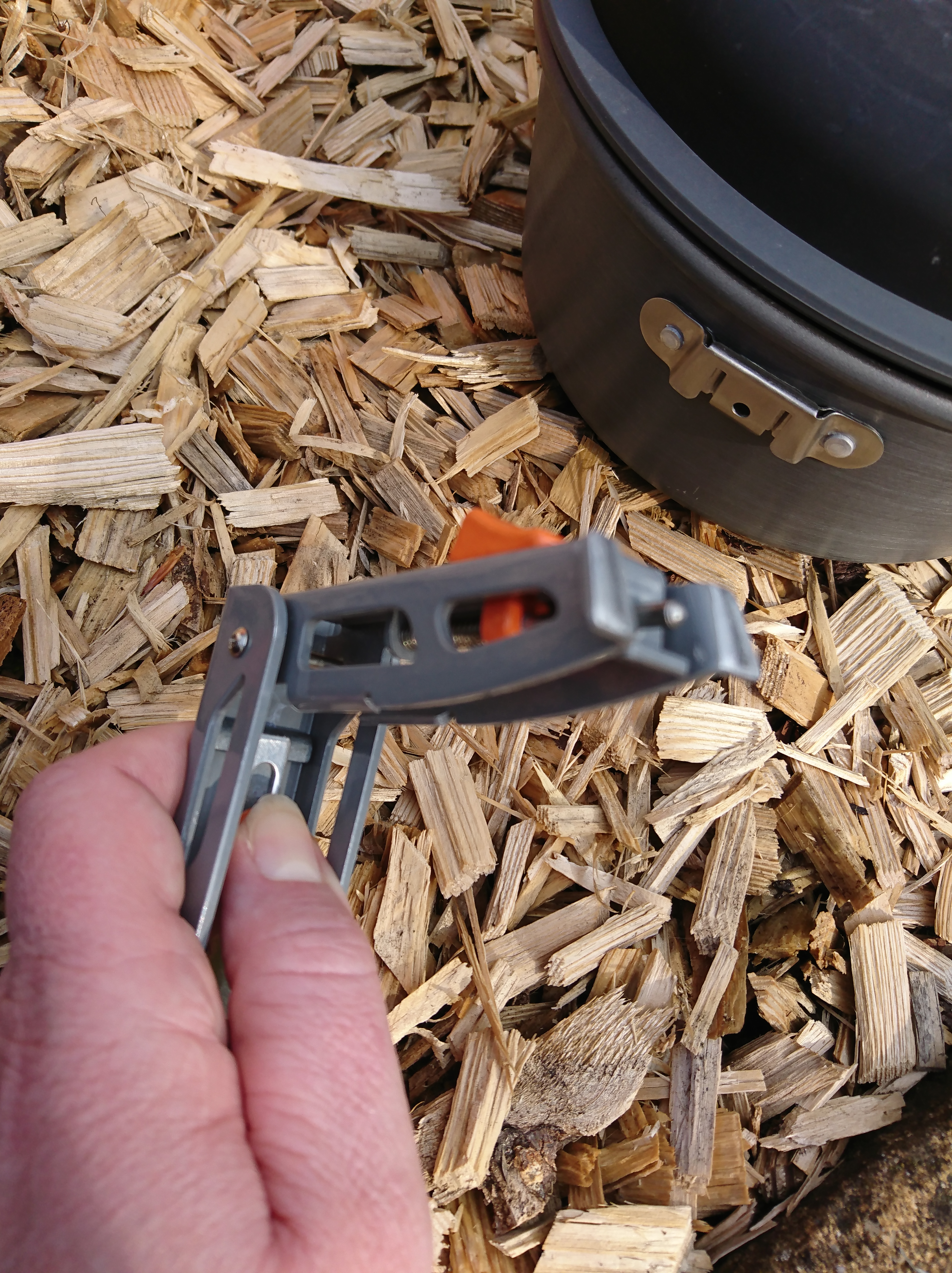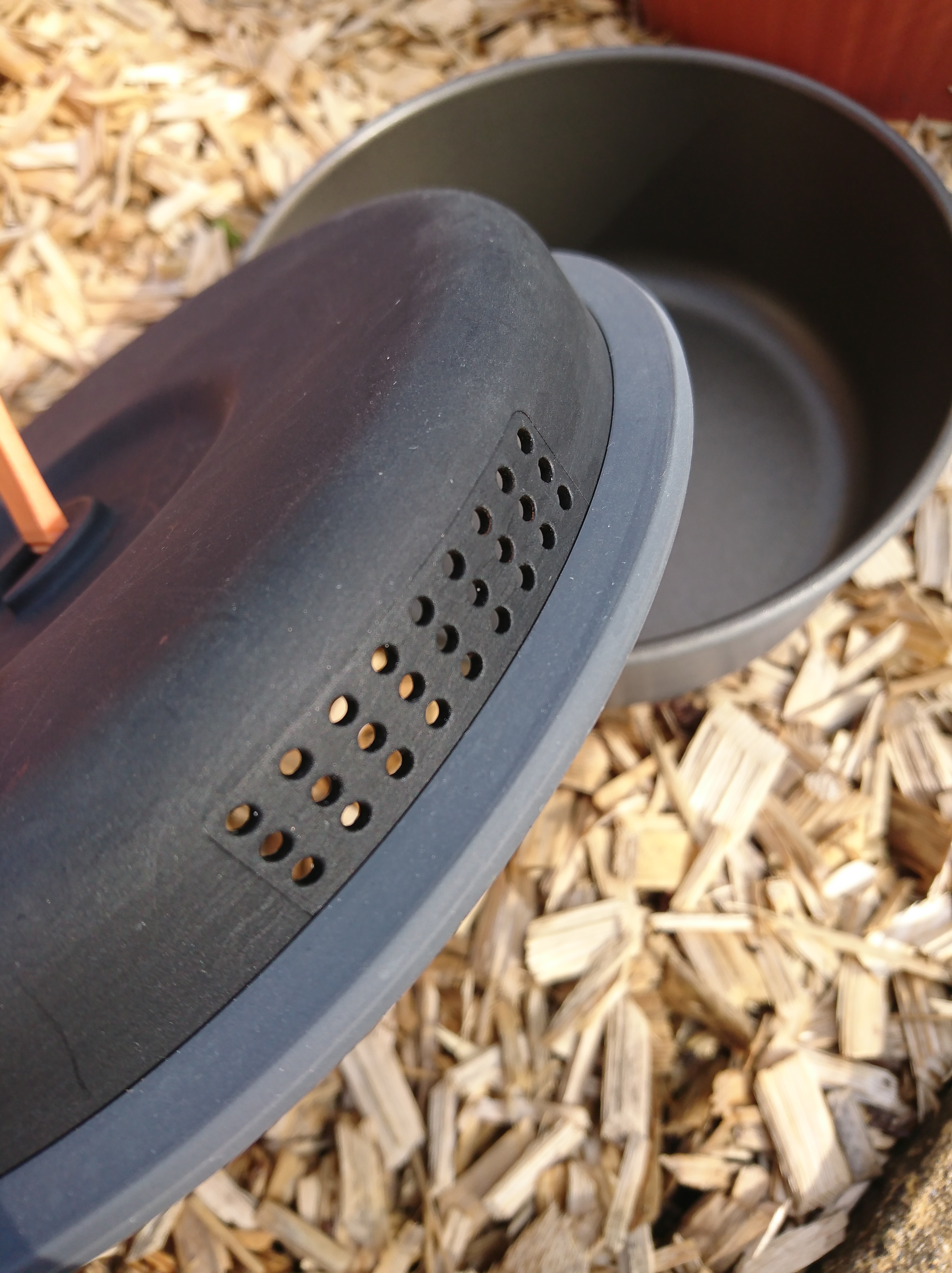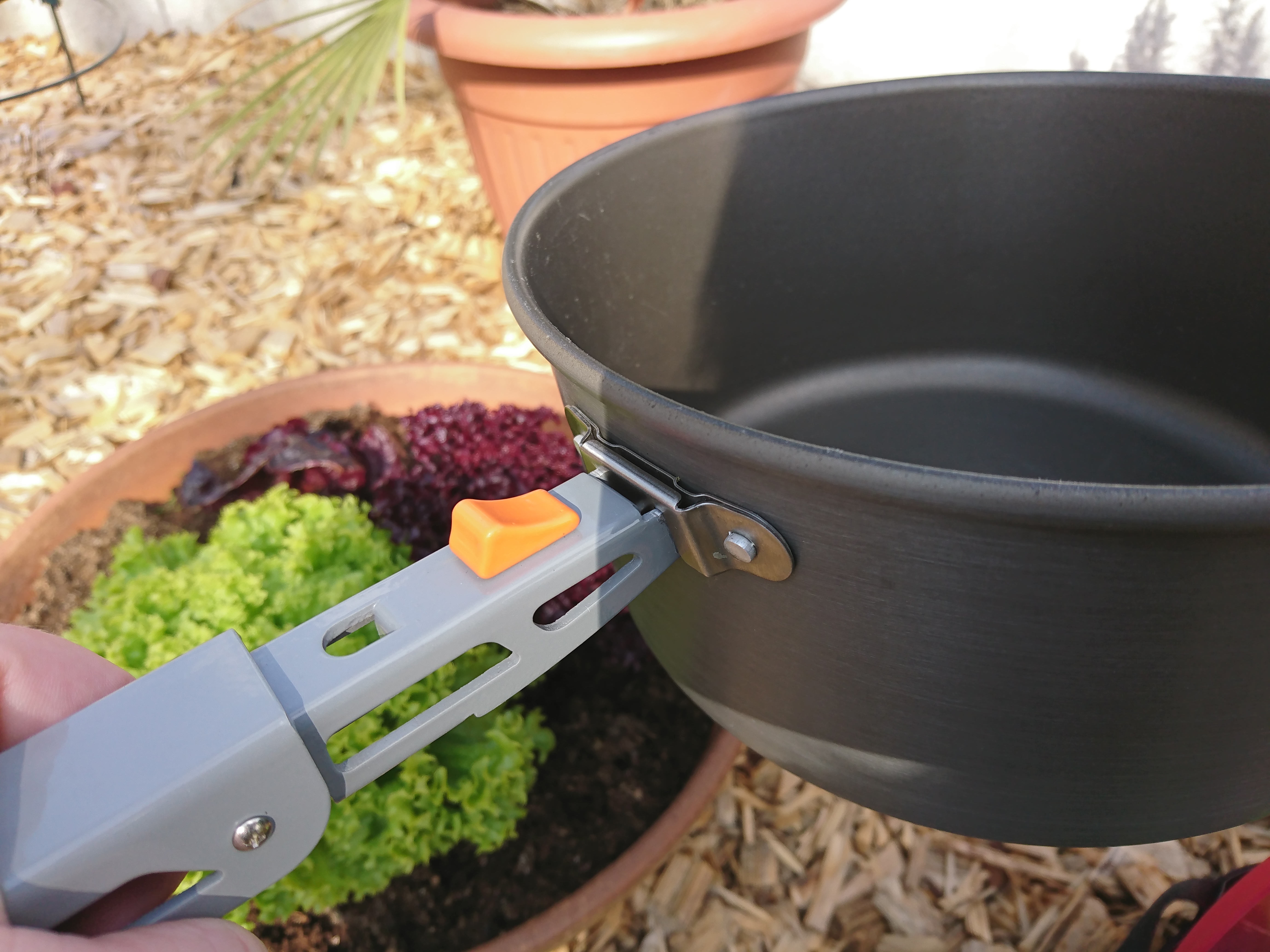 Die Deckel der Töpfe haben einen einklappbaren Griff, der zum Kochen schon hochgestellt sein sollte, damit er nicht warm wird und eine Ausgiessfunktion. Im Allgemeinen ganz nett, aber man muss sehr auf den Wasserdampf aufpassen und den Deckel richtig festhalten. Das gezeigte „3Finger“ Prinzip, auf der üblichen Verkaufseiten, funktioniert nicht gut. Wenn es heiss wird greift man nicht mehr richtig zu und hat die Nudeln aus dem Topf gekippt. Ist uns schon passiert und war nicht lustig …. Deswegen haben wir jetzt zusätzlich ein faltbares Küchensieb dabei.