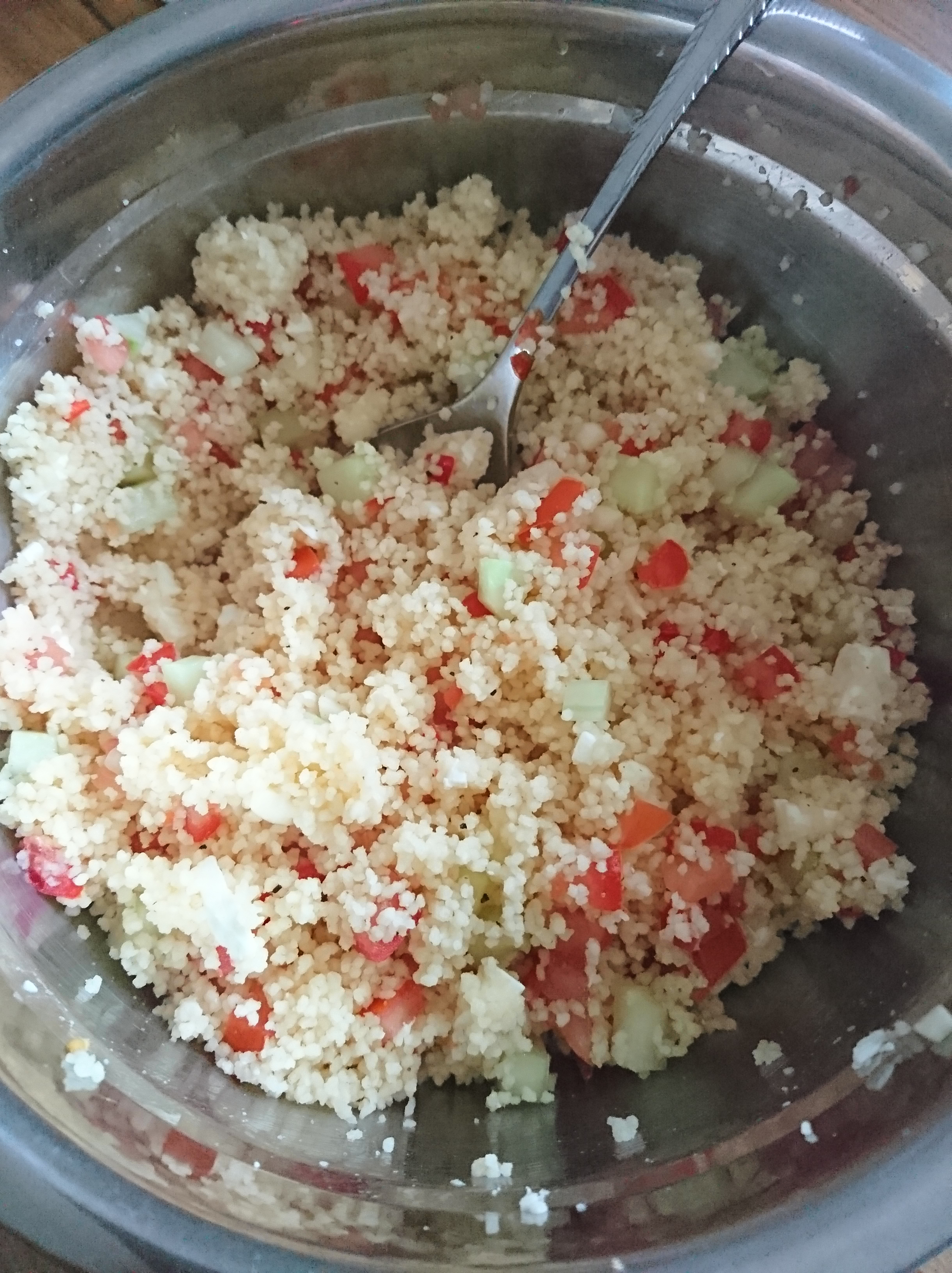 Wasser aufkochen, Couscous dazugeben und einmal umrühren so dass er im Wasser liegt. Deckel auf den Topf und von der Flamme nehmen. 5 Minuten Quellen lassen, danach mit einer Gabel umrühren und auflockern. Die Restlichen Zutaten kleingewürfelt dazugeben, salzen und pfeffern … fertig!