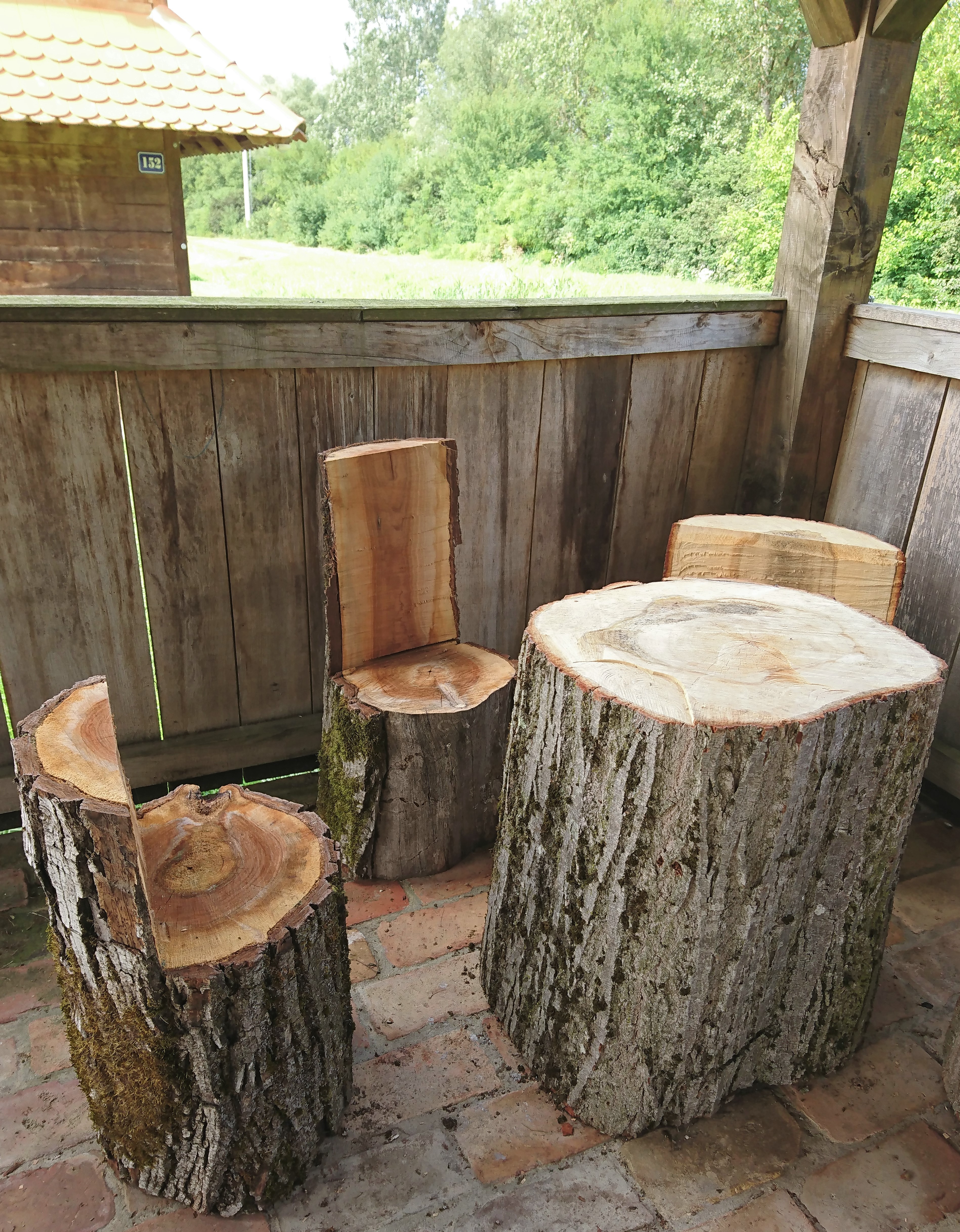 Eine Küche gibt es nicht, aber einen großen hölzernen Pavillon mit Tischen und Bänken und gesägten Sitzmöbeln. Dahinter befindet sich eine mit Steinen eingefasste Lagerfeuerstelle und Holz dafür ist auch vorhanden.