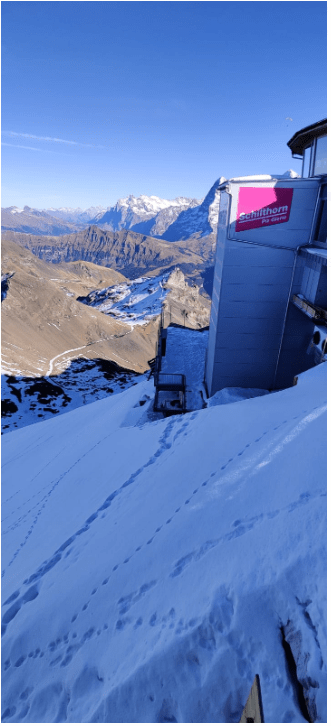 Den Gipfel erreicht man über eine Seilbahn mit grossen Gondeln, Sitzmöglichkeiten gibt es in diesen so gut wie keine. Das Schilthorn ist die Letzte von 4 Stationen. Man muss 3x umsteigen und die Gondeln wechseln. Die Seilbahn ist recht steil und die Höhenmeter werden zügig überwunden. Wir hatten einen ruhigen Tag ausserhalb der Saison erwischt und brauchten ohne jegliche Warteschlangen vom Ticketkauf bis zum Gipfel ca. 1 Stunde. Die in der Webseite angegebenen 32Minuten sind sehr ambitioniert.
