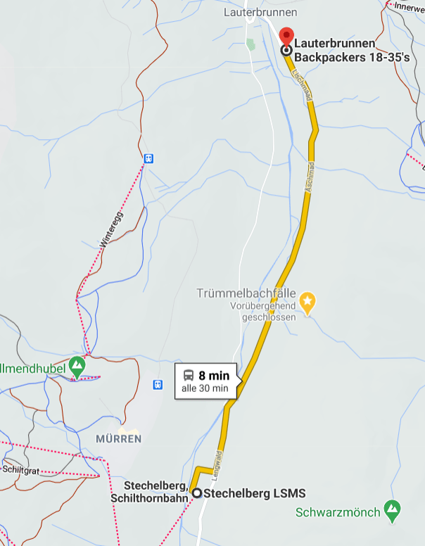 Zu den beeindruckenden Trümmelbachfällen ist es nur ein Katzensprung von ca.2,5Km/30Min.zu Fuss. Je nach Wetterverhältniss sind diese von Anfang April bis Anfang November geöffnet. Vor Anreise bitte unbedingt die Öffnungszeiten auf der Webseite kontrollieren.