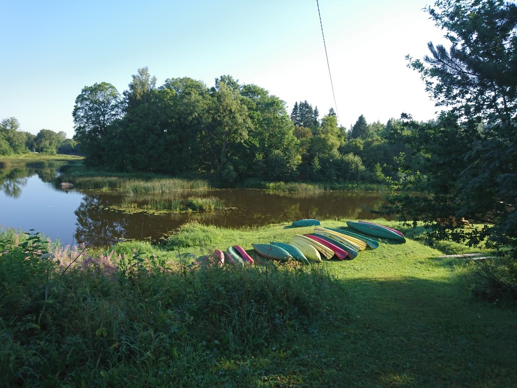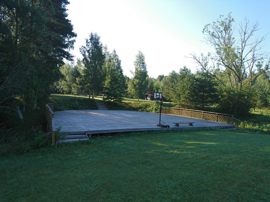 Es gibt 3 Abschnitte zum Campen. 2 Trockentoiletten und ein Abwaschbecken im hinteren Bereich, sowie eine grosse Feuerstelle. Der CP endet hier an einer grossen Pferdekoppel. Mittig vom Campingplatz ist ein Bereich mit Holzbohlen ausgelegt zum Basketballspielen. Es gibt ein Zugang zum Fluss und auch Kajaks zum mieten, wahrscheinlich kann man sogar baden gehen und eigene Kajaks zu Wasser bringen. Diese STellen erreicht man am Besten über den Vorderen linken Campingbreiech. Die Sanitäranlagen im vorderen Campingbereich sind sauber und sehr schön, allerdings nur 1 WC jeweils für Damen und 1x für Herren. Durch die Tür mit dem Herren WC-Schild geht es zur einzigen grosszügigen Dusche und Waschmaschine nebst Wäscheständer. ( WC ist aber nochmal ein separater Raum 😉 ) Duschen kostet pauschal 2€ p.P. und Nutzung (2018). Mit eigener Feuerschale und seinem Holz kann man auch selber am Platz ein Lagerfeuer machen.