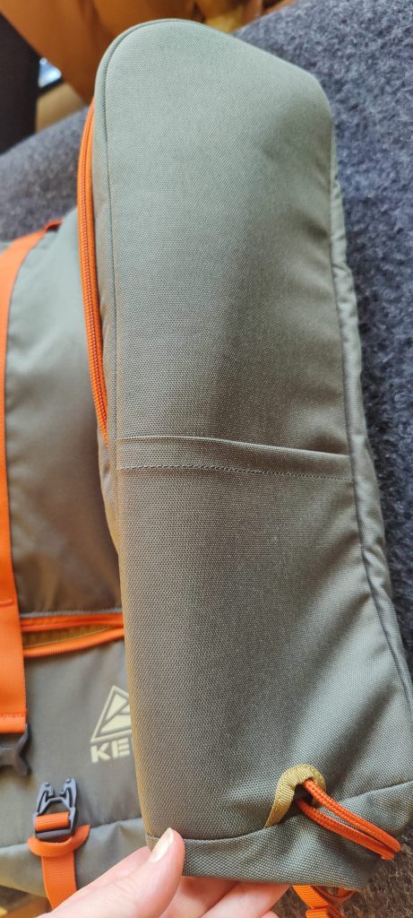 Die beiden Seitentaschen, die von aussen zugänglich sind, bieten Platz für eine Grillzange, Brotmesser oä. Das Material ist leider nicht elastisch und wenn die Tasche gut gepackt ist oder eine Fl. Wein von innen dagegendrückt, wird es eng.