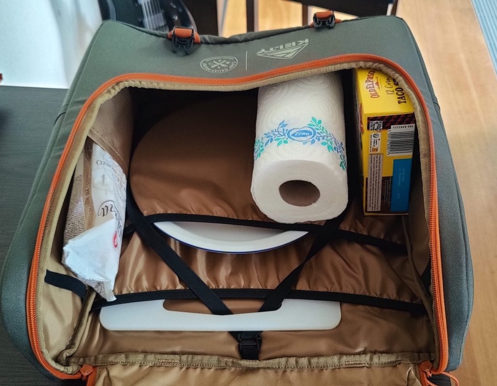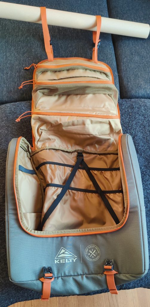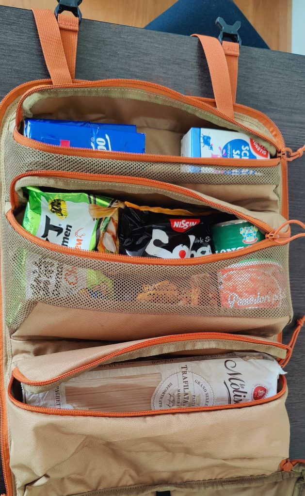 Eigentlich ist das Teil für die Küchenartikel auf Reisen konzipiert. Aber ich habe es auch schon als Reiseapotheke gepackt und zusätzliche Hygieneartikel darin verstaut. Man kann auch seine Kleidung ordentlich aufrollen und übersichtlich stapeln. Die Taschen oben dann für Socken und Unterwäsche nutzen. Der Fantasie sind keine Grenzen gesetzt. Unser KO Kriterium war einfach, dass sie nicht in unsere Alu-Boxen passen und wir nichts extra im Wagen aufhängen wollen.