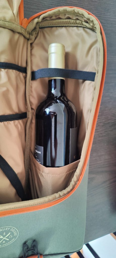Im Inneren des Organizer ist Platz für ein Schneidbrett, das von Ikea verschwindet regelrecht in der grossen Tasche. Rechts und links kann man jeweils ein Flasche Wein oder Olivenöl sicher unterbringen. Auch die Rolle Küchenpapier findet hier Platz. Sonst kann diese an einem Seil, unter der Tasche, eingehängt werden.